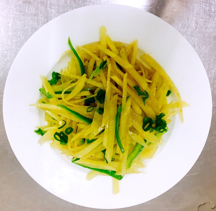 3、? 放入土豆絲和青椒絲,大火爆炒,土豆絲快熟時放入醬油、米醋、鹽,略炒一下出鍋即可。