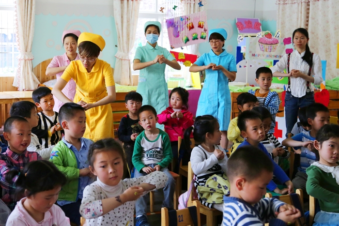 ??? 四月的春天枝繁葉茂,綠意濃濃,和煦的春光向人們傳遞著陣陣暖意。4月17日下午,我院外科片護士長陳月卿帶領(lǐng)由口腔科、產(chǎn)科、兒科、婦科、手術(shù)室10名醫(yī)護人員組成的志愿者隊伍來到柯城區(qū)教工幼兒園,為幼兒們進行口腔保健、手衛(wèi)生知識宣教指導(dǎo)。