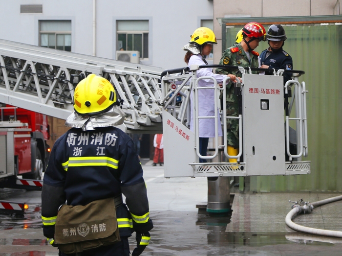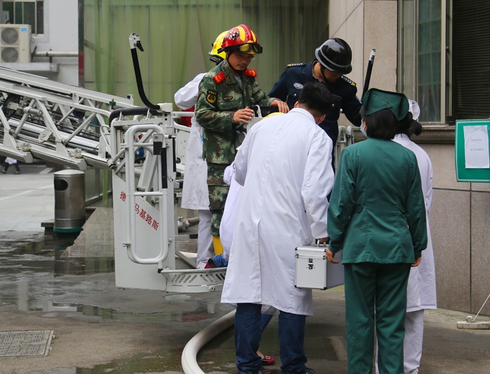 ??? 4月11日下午3時(shí)35分,一輛消防車駛?cè)胛以?,消防員拋水帶、架云梯、連接消防栓,一邊撲火,一邊用云梯解救被困急診四樓的“患者”、“家屬”及醫(yī)護(hù)人員。
