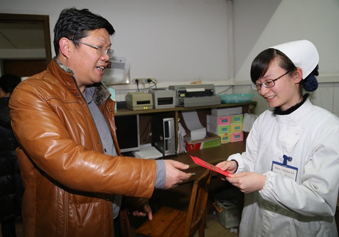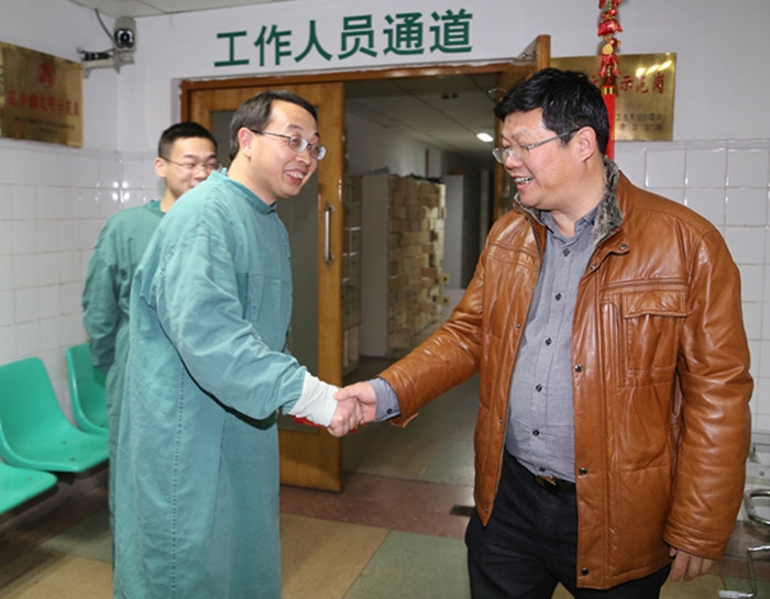????? 除夕夜晚7時(shí),院長(zhǎng)陳震宏、黨委書(shū)記徐天才率副院長(zhǎng)周見(jiàn)、副院長(zhǎng)王巨宏及相關(guān)職能部門(mén)負(fù)責(zé)人深入各臨床住院病區(qū)、急診、醫(yī)技科室、藥房、后勤保衛(wèi)等部門(mén),向春節(jié)期間仍堅(jiān)守崗位的一線職工致以最誠(chéng)摯的節(jié)日問(wèn)候和新春祝福。?
