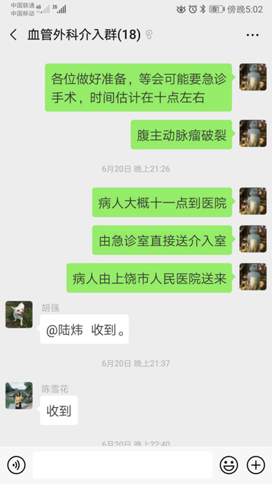 搶救經(jīng)驗(yàn)豐富的血管外科值班醫(yī)師程國兵也馬上通知醫(yī)院急診科、麻醉科、手術(shù)室做好搶救準(zhǔn)備。