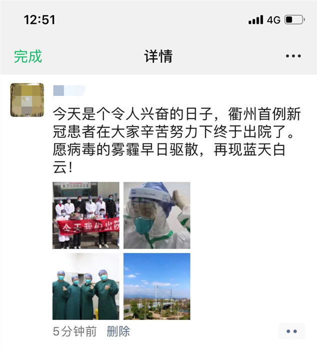“我很感動,感謝衢州市人民醫(yī)院的醫(yī)生、護士。住院治療期間,最辛苦的是幫助我們的每一個醫(yī)護人員,醫(yī)生護士不離不棄,一直守護在身邊,我能這么快出院,離不開他們精心的護理和治療?!焙勘硎?,住院期間得到了醫(yī)護人員的精心照顧,出院后還會留在家中繼續(xù)做好自我隔離,密切留意身體狀況。