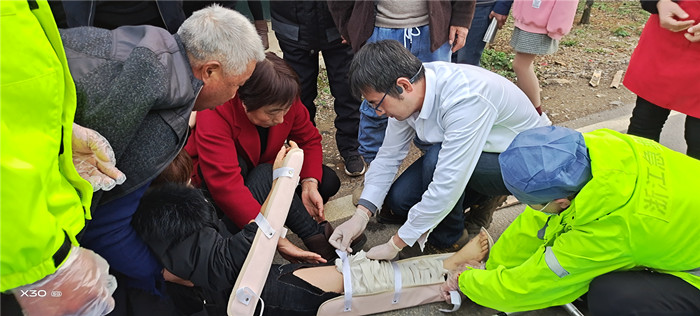 “不能亂動(dòng),讓我看看嚴(yán)不嚴(yán)重!”嚴(yán)欣江一邊撥打120急救電話,指導(dǎo)現(xiàn)場(chǎng)群眾疏導(dǎo)過往車輛,一邊檢查傷勢(shì)。