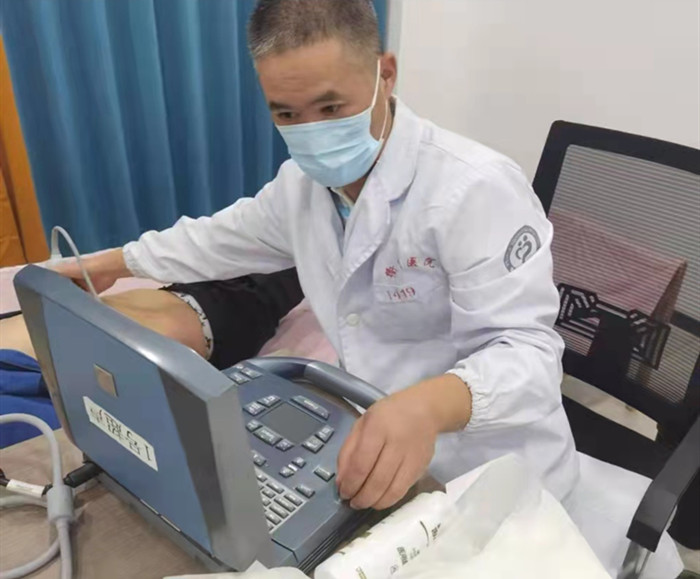 超聲科主任周余旺在現(xiàn)場(chǎng)給職工們進(jìn)行超聲檢查