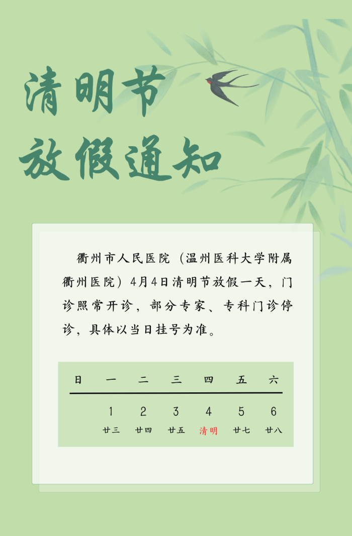 我院2024年清明節(jié)門(mén)診安排 文章來(lái)源:門(mén)診部 作者: 點(diǎn)擊數(shù):2023 更新時(shí)間:2024-04-03 上一篇: 五一放“價(jià)”,摘鏡出游約一波~~ 下一篇: 衢州首站!“健康浙里行——走基層、惠民生”媒體采風(fēng)活動(dòng)走進(jìn)我院