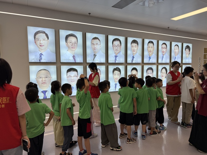 開營首日的“職場探秘”成了孩子們最期待的活動。在老師們的引導下,萌娃牽著小手,排著整齊的隊伍穿行于院區(qū)。走進人才學科長廊,墻上展示的“醫(yī)學超人”瞬間抓住了孩子們的目光,有的不禁歡呼道:“這是我媽媽!”。
